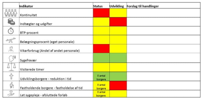 Som del af den ny ydelsesstruktur og afregningsmodel får borgerteamet hver måned et databaseret styringscockpit udarbejdet af back office. Styringscockpittet giver et overblik over, hvordan det går for borgerteamet baseret på en række centrale nøgletal. Nøgletallene giver borgerteamet gode muligheder for at følge med i, hvordan økonomien i teamet udvikler sig. Det vil sige, hvordan det ser ud med borgerteamets udgifter til blandt andet løn og vikarer i forhold til teamets indtægter fra borgernes takster.