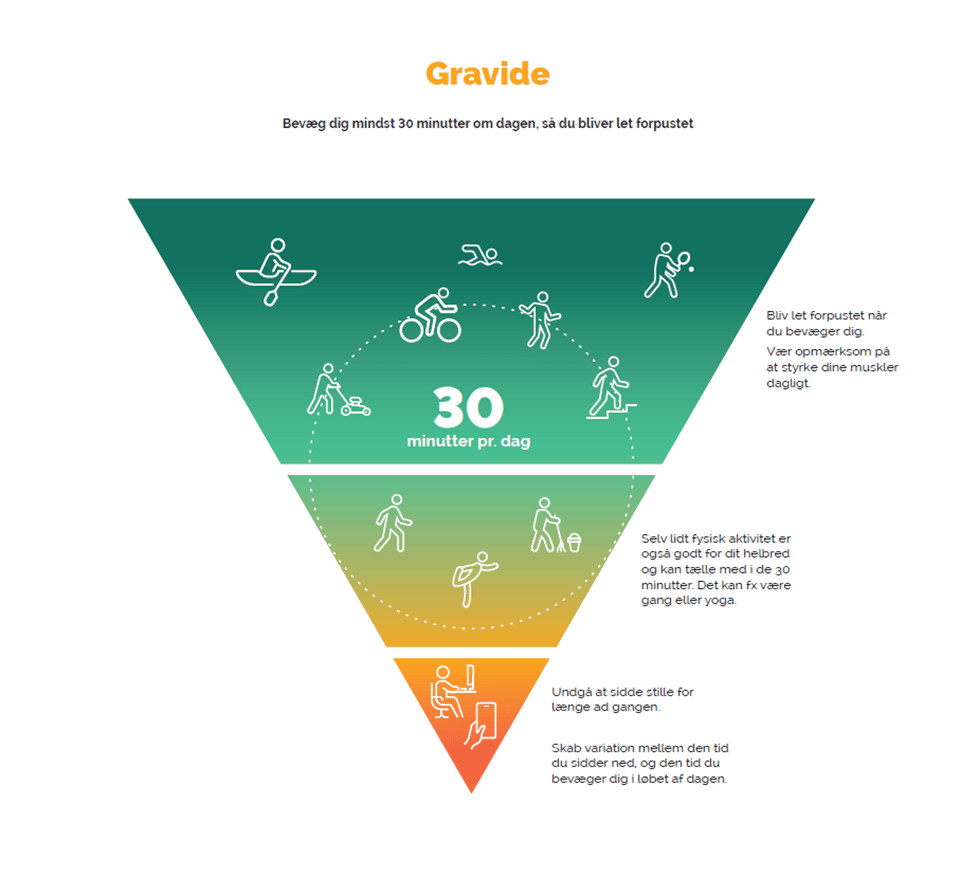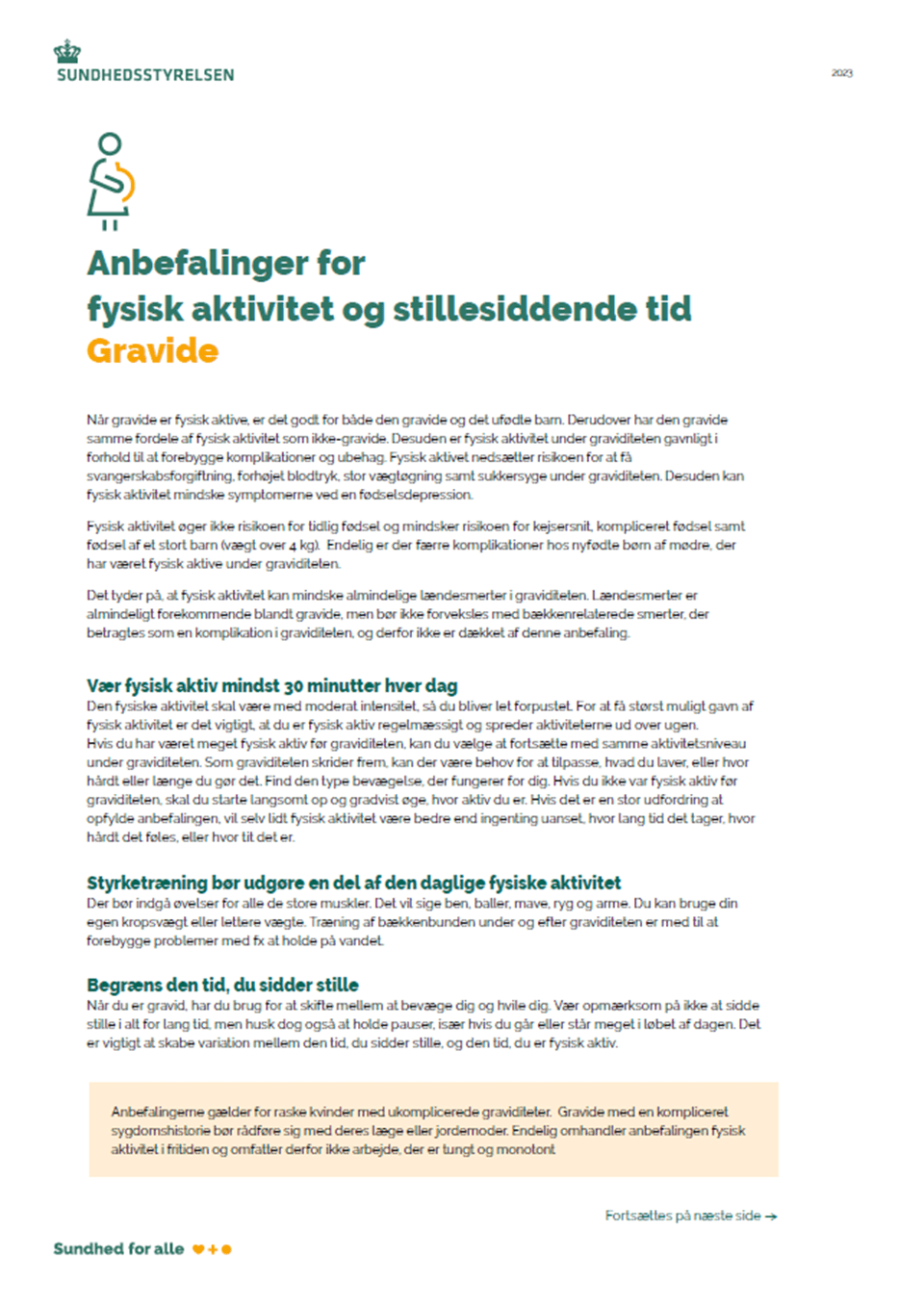 Endvidere opfordres gravide til at lytte til kroppens signaler, når der udøves fysisk aktivitet, samt rådføre sig med læge eller jordemoder ved tvivlstilfælde.
