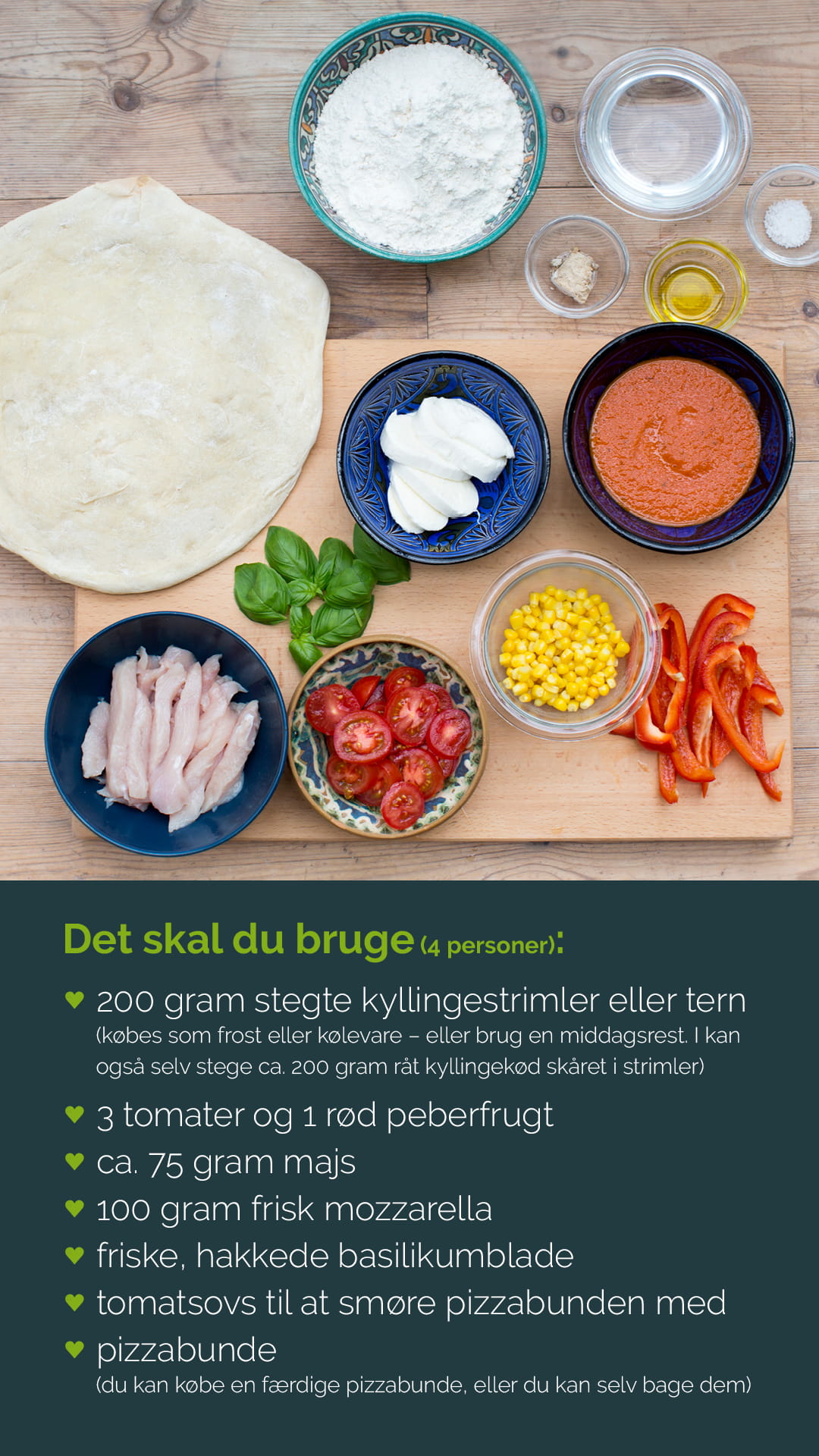 Her kan du se, hvordan du laver pizza med kylling, majs og mozzarella.