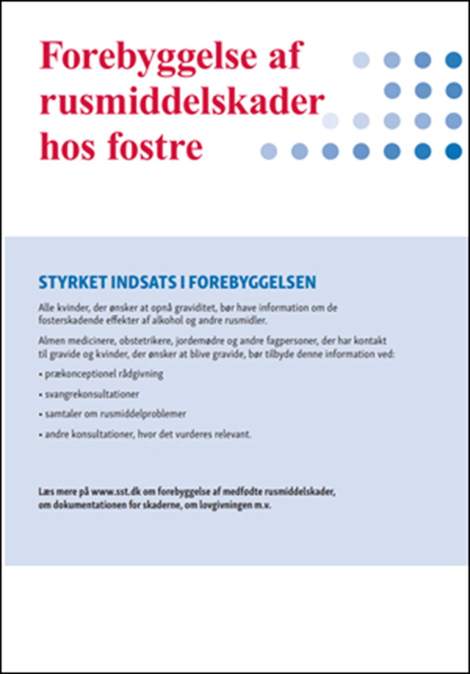 For at styrke forebyggelsen af medfødte skader hos fostre som følge af alkohol og andre rusmidler har Sundhedsstyrelsen udarbejdet følgende materiale til brug for læger, jordemødre og andre sundhedsprofessionelle i almen praksis og inden for det gynækologisk obstetriske speciale: