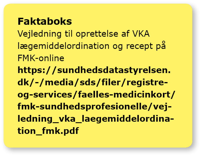 Vær dog opmærksom på, at informationer om kontroldatoer stadig vil være at finde i epikrise og anden kommunikation. Hør mere hos din lokale IT-leverandør eller læs mere i Sundhedsdatastyrelsens Vejledning til oprettelse af VKA lægemiddelordination og recept på FMK-online, der blandt andet også indeholder en one-pager om VKA-vejledningen.