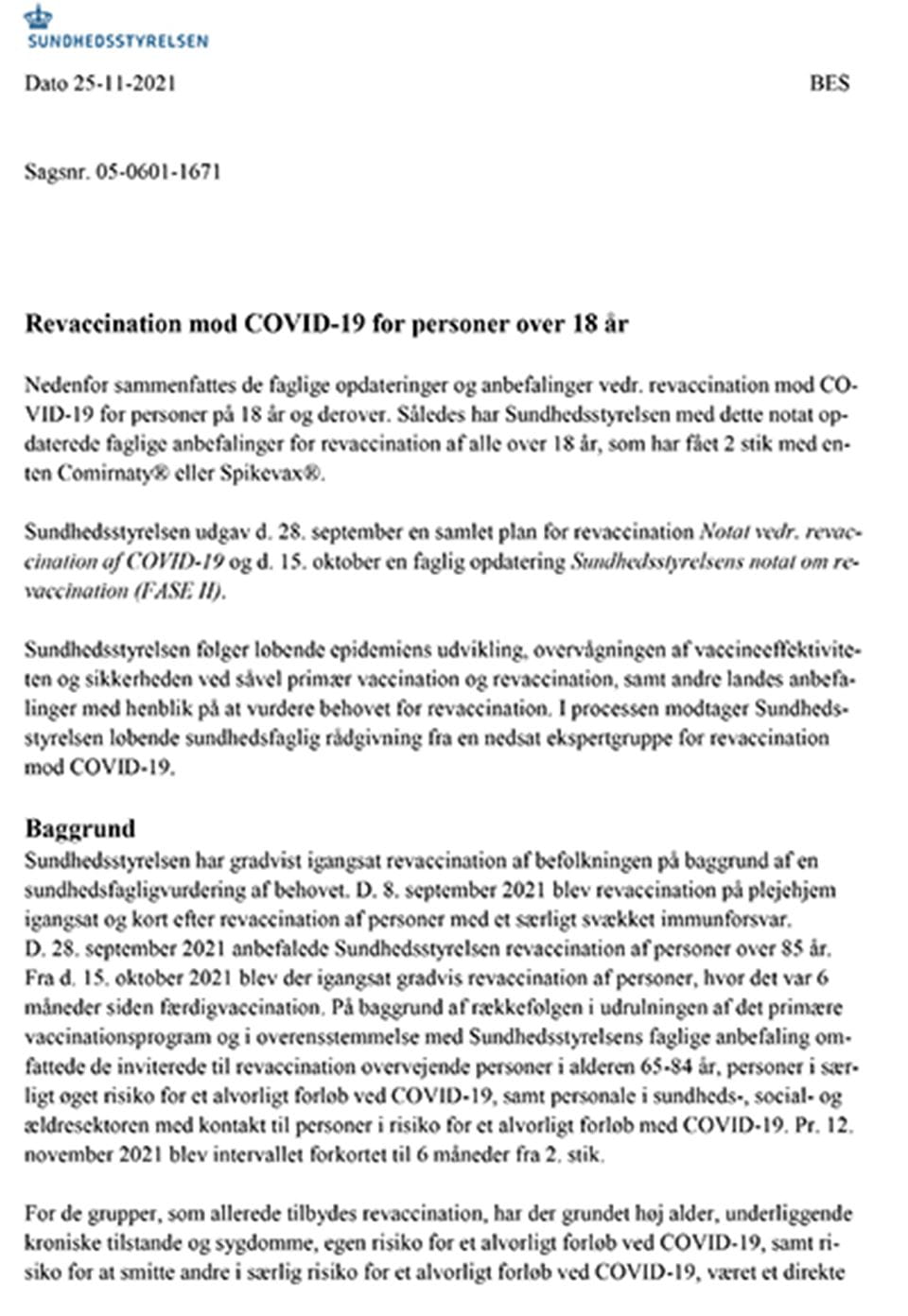 Notatet sammenfatter de faglige opdateringer og anbefalinger vedr. revaccination mod covid-19 for personer på 18 år og derover. Således har Sundhedsstyrelsen med dette notat opdaterede faglige anbefalinger for revaccination af alle over 18 år, som har fået 2 stik med enten Comirnaty® eller Spikevax®.