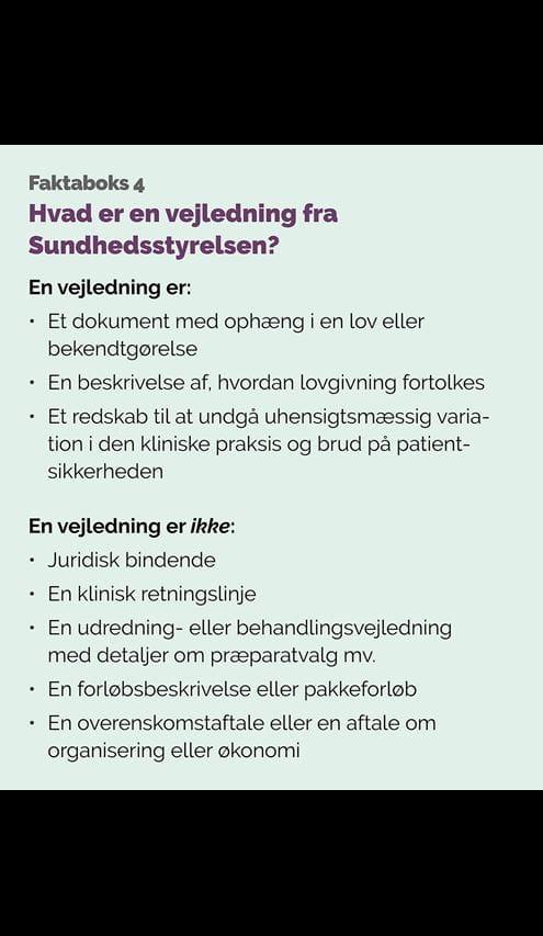 En vejledning præciserer og uddyber en lov eller bekendtgørelse, som er juridisk bindende. Langt størstedelen af Sundhedsstyrelsens vejledninger på lægemiddelområdet har ophæng i Autorisationslovens § 17, der bl.a. beskriver, at ”en autoriseret sundhedsperson er under udøvelsen af sin virksomhed forpligtet til at udvise omhu og samvittighedsfuldhed” [1]. Vejledninger publiceres på retsinformation.dk sammen med andre love og bekendtgørelser. Af faktaboks 4 fremgår en uddybning af, hvad en vejledning er og ikke er.