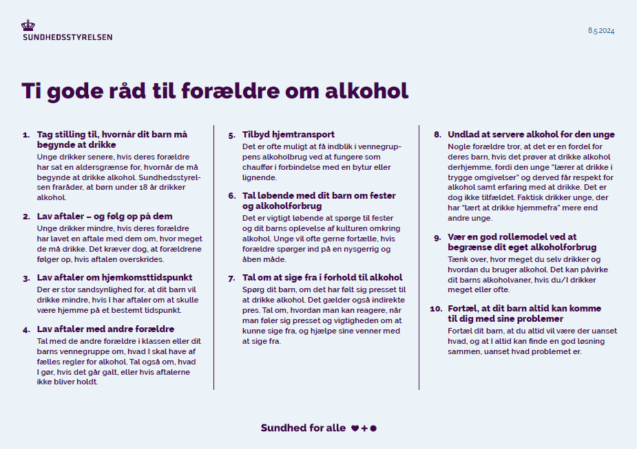 Sundhedsstyrelsen har formuleret 10 gode råd til forældre om alkohol, der skal hjælpe forældre til at tage snakken med deres barn. Undersøgelser viser, at unge drikker mindre, hvis de har lavet tydelige aftaler om alkohol med deres forældre.