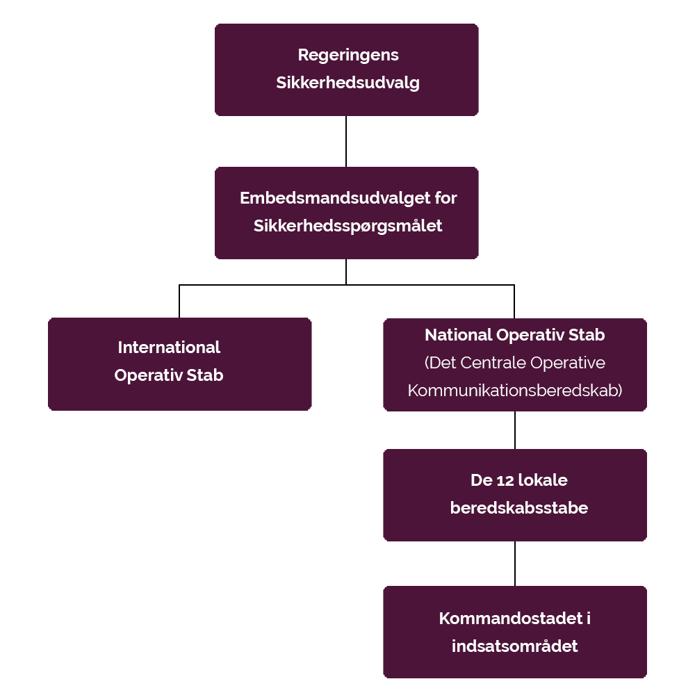 - Regeringens krisestyringsorganisation, bestående af Regeringens Sikkerhedsudvalg og Embedsmandsudvalget for Sikkerhedsspørgsmål