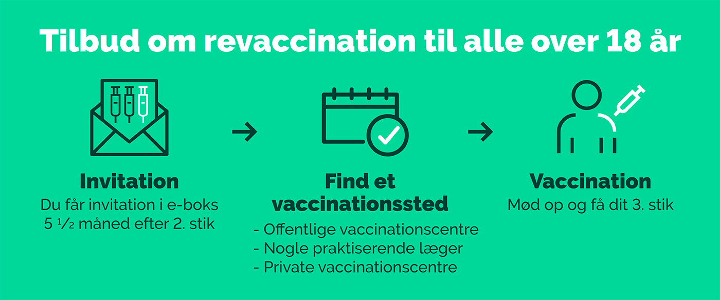 Sundhedsstyrelsens mål er, at alle skal have en vaccination senest 7 dage efter invitationen til 3. stik. Og revaccinationsindsatsen får nu et ekstra skub. Fremover vil alle blive inviteret til det 3. stik 5½ måned efter 2. stik, så man kan bestille tid og blive vaccineret inden den 6. måned.
