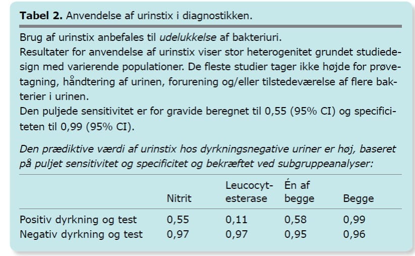 Screening for asymptomatisk bakteriuri er i Danmark del af den almindelige svangreprofylakse, og hos alle gravide undersøges urinen som regel ved stix ved rutinekontroller hos egen læge og jordemoder (12, 13). Urinstix har høj negativ prædiktiv værdi, men er upålidelig til diagnostik af UVI. Ved en positiv stix hos asymptomatiske gravide bør urinen derfor dyrkes før opstart af antibiotika (se Tabel 2)(14, 15). Det er vigtigt, at urinprøven er taget under så rene forhold som muligt og som midtstråleurin, da mange gravide ofte har øget udflåd og/eller øget kolonisering af perinæum. Signifikant bakteriuri hos gravide uden symptomer defineres som dyrkning af >100.000 CFU/ml af samme bakterieart (16). Screening anbefales især i starten af graviditeten, og det anbefales ligeledes at følge op på tidligere positive dyrkningsfund. I særlige tilfælde anbefales rutinemæssigt urindyrkning: hos gravide med anamnese med hyppige urinvejsinfektioner, med UVI tidligere i aktuelle graviditet, eller hvis der i tidligere graviditeter har været præterme veer, præterm vandafgang eller pyelonefrit. Der foreligger ingen rekommandationer for screening i den sidste del af graviditeten hos gravide, hvor urinen ved tidligere undersøgelser er fundet negativ (8, 17).