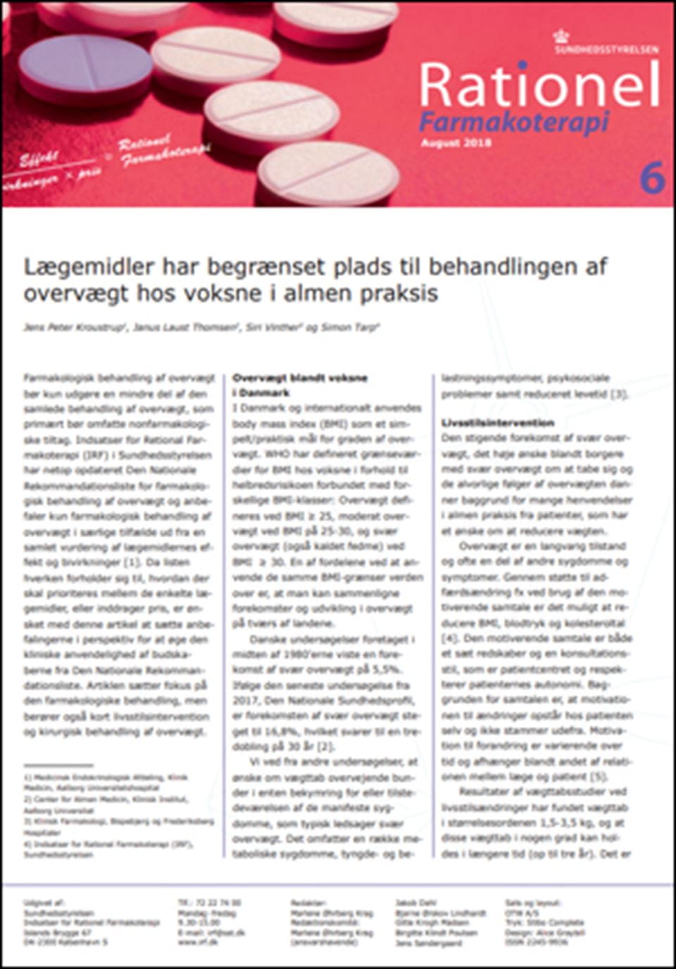 Dette månedsblad består af artiklerne 'Lægemidler har begrænset plads til behandlingen af overvægt hos voksne i almen praksis' og 'Peroral ampicillin anbefales ikke'.