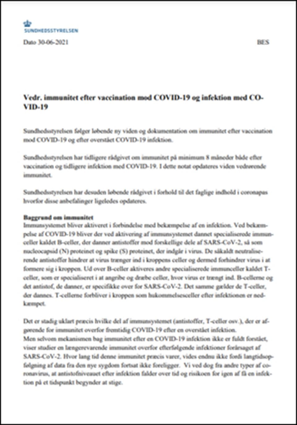 Vedr. immunitet efter vaccination mod covid-19 og infektion med covid-19