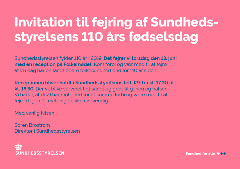 Sundhedsstyrelsen fejrer også, at det er 110 år siden, at Sundhedsstyrelsen blev dannet. Det sker med en åben reception på Folkemødet torsdag den 13. juni, fra 17.30-18.30 i Sundhedsstyrelsens telt (J 27).