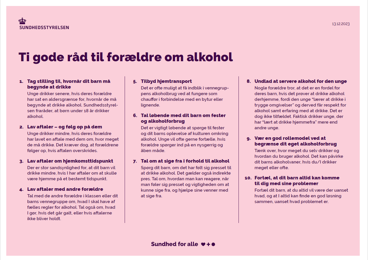 Sundhedsstyrelsen lancerer i dag en kampagne, der handler om forældres betydning og ansvar i forhold til børns alkoholvaner. Kampagnen indeholder blandt andet 10 gode råd til forældre om at lave aftaler om alkohol.
