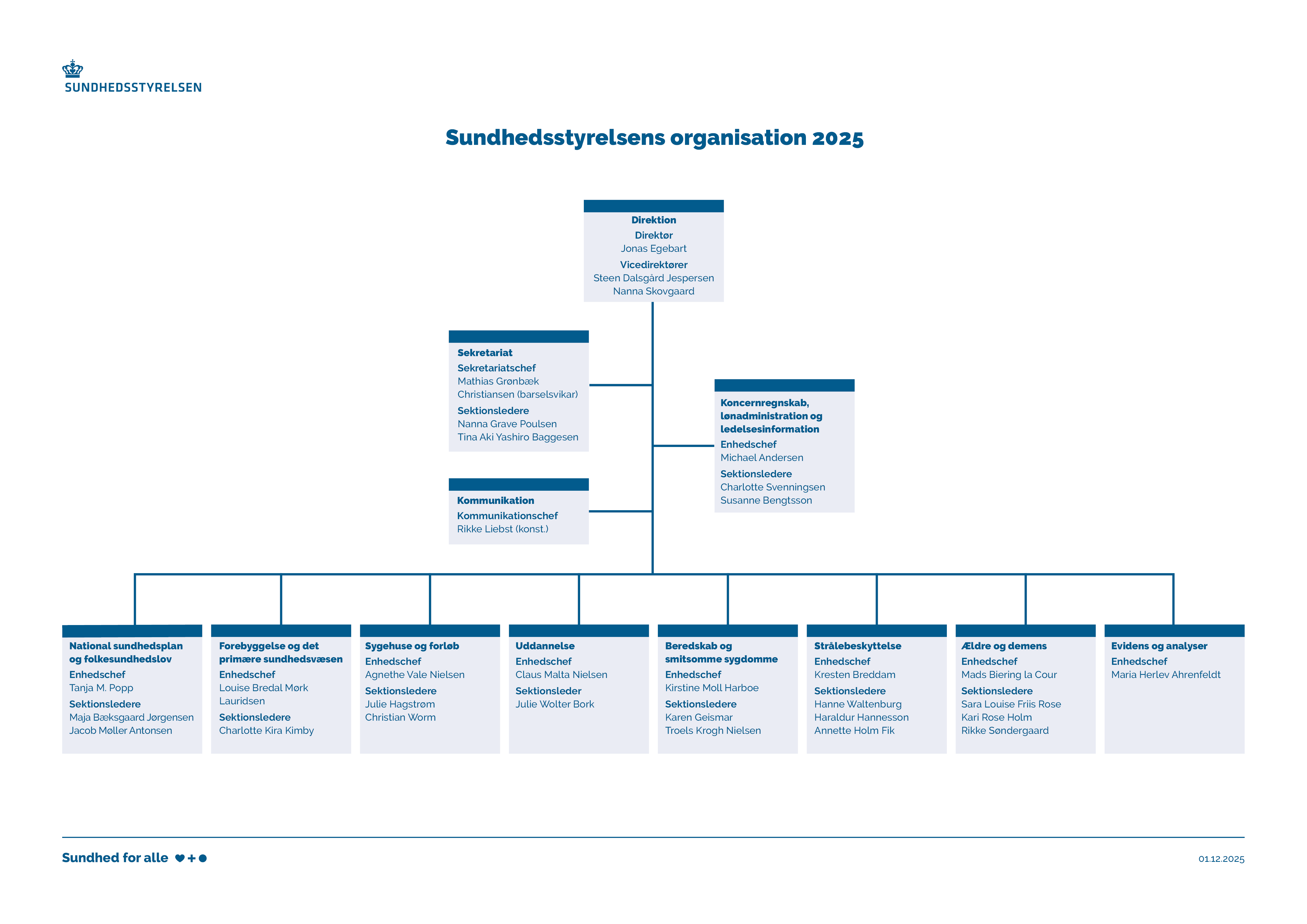 Alle enheder refererer til Sundhedsstyrelsens direktør og vicedirektører. Chefgruppen består af direktør, to vicedirektører og enhedschefer.