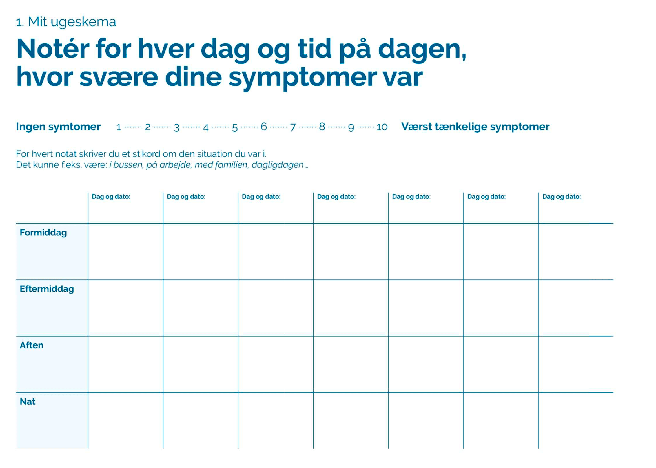 - Udfyld skemaet 4 gange om dagen, så du registrerer de symptomer, du har om formiddagen, eftermiddagen, aftenen og om natten.