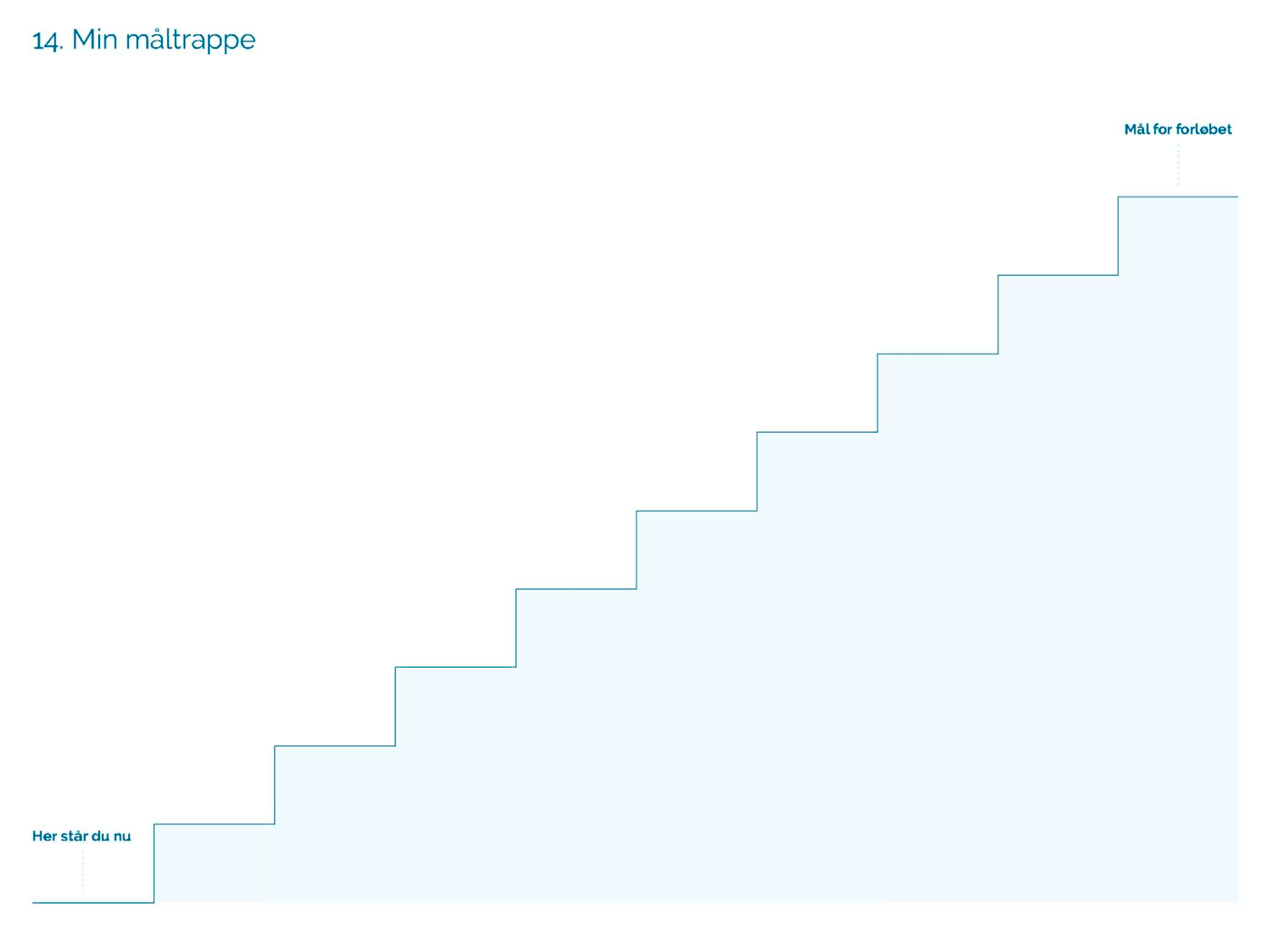 - Først skal du definere dit overordnede mål. Det er vigtigt at overveje målet grundigt. Som hjælp kan du med fordel benytte redskabet ’Mit SMARTE mål’. Når du har besluttet dig for, hvilket mål du vil arbejde hen imod, noterer du det øverst på trappen.