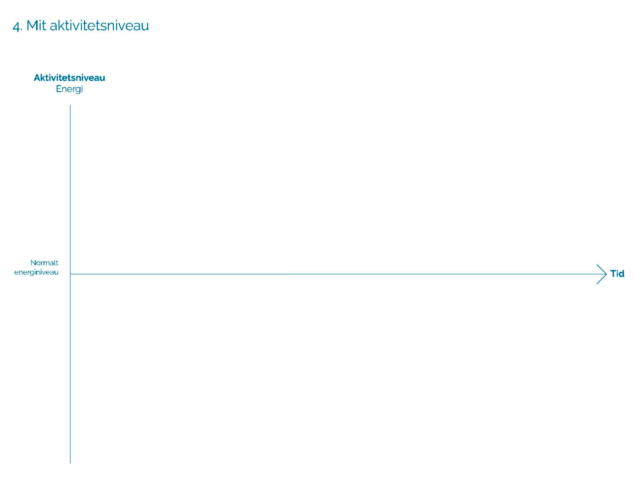 - Tænk tilbage på de seneste 2 uger. Hvordan har dit aktivitets- og energiniveau været? Har det været stabilt? Eller har der været udsving? Hvis det er for vanskeligt at huske de sidste 2 uger, kan du i stedet vælge at lave skemaet de kommende 2 uger, hvor du for hver dag markerer, hvordan dit niveau har været (på tidsaksen). Aktivitetsniveauet kan for nogle svinge i løbet af dagen. Hvis det er tilfældet for dig, må du meget gerne markere dit niveau på figuren flere gange i løbet af dagen.