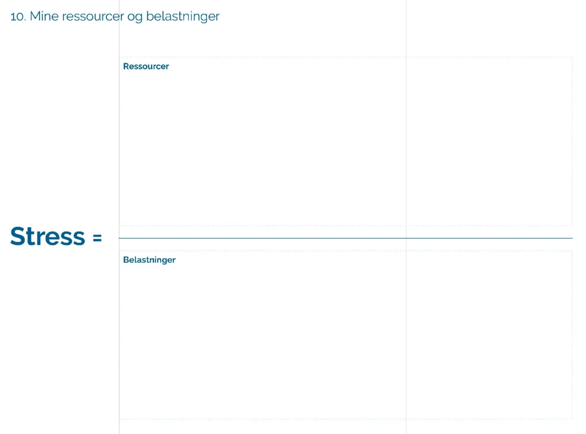 - Overvej, hvilke belastninger du har i dit liv. Tænk f.eks. over følgende områder: Din økonomi, dit parforhold, forholdet til dine forældre, søskende, børn, kolleger og naboer, dit arbejde, dit forhold til mad, tobak, alkohol, motion, sociale medier, hvile, søvn og aktivitet, dine fritidsinteresser, dit sociale netværk, din fortid, mulighederne for din fremtid mv.