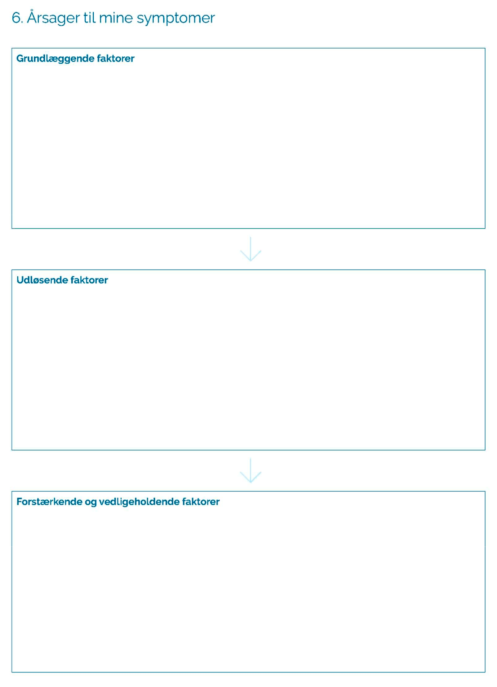 Udfyld hver kasse med de stikord, som, du tænker, passer på dig og din situation, ud fra beskrivelsen af de grundlæggende, udløsende, forstærkende og vedligeholdende faktorer herunder: