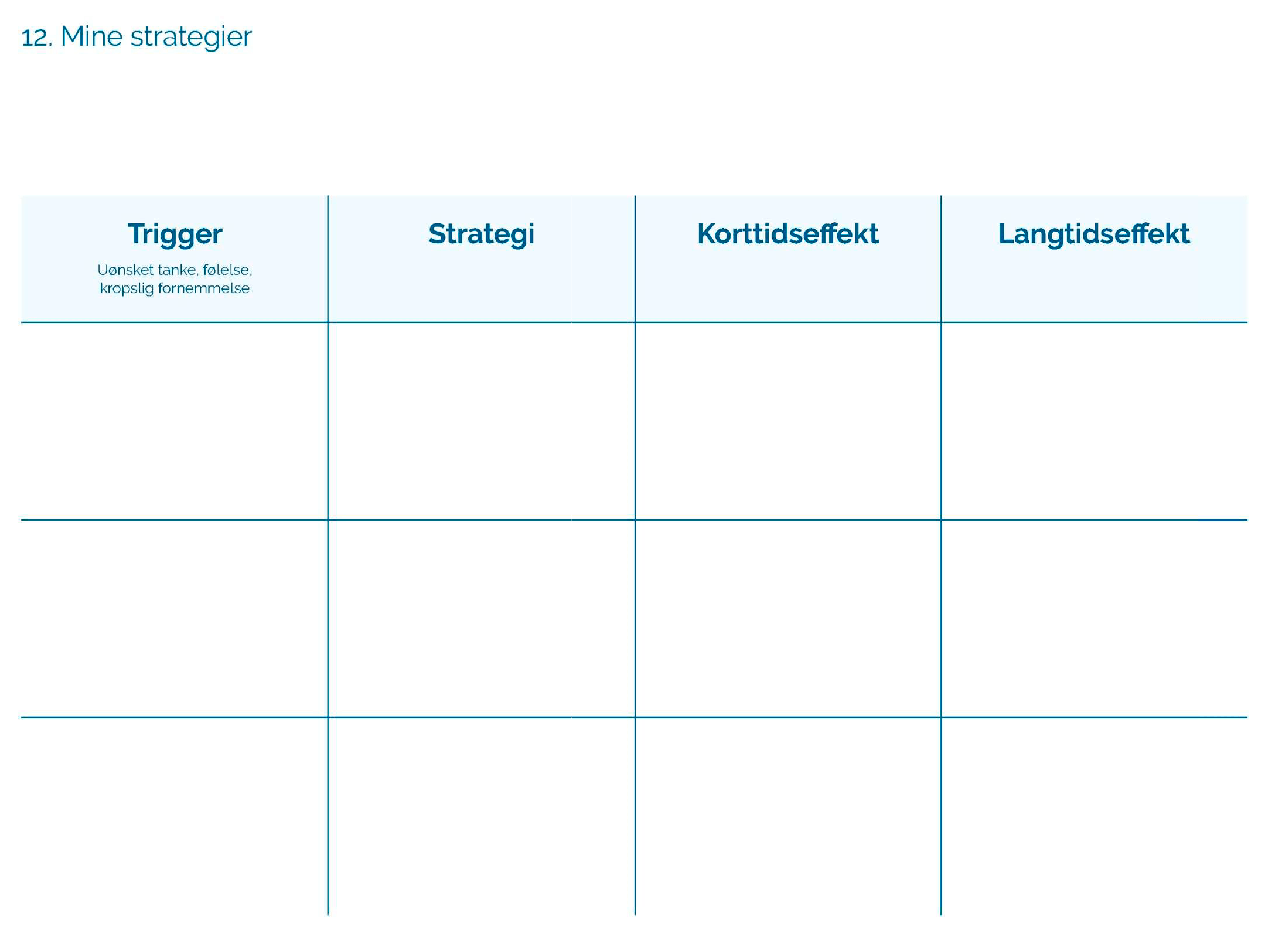 - Beskriv hvad der i en konkret situation kan ’trigge’ en af dine strategier. Det kan f.eks. være ’smerte’ eller ’hovedpine og lydoverfølsomhed fordi børnene larmer’.