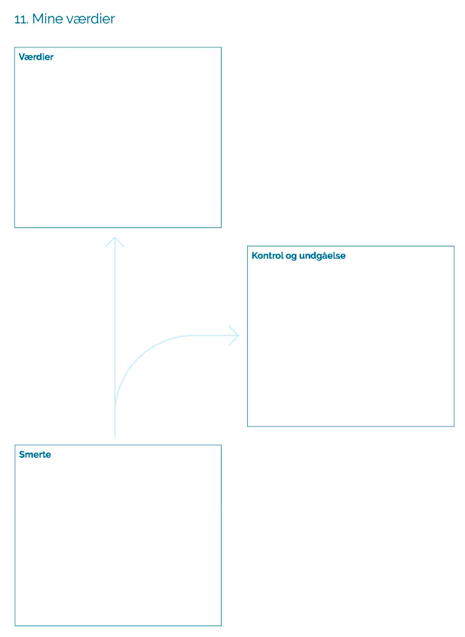 - Tænk over dine værdier og notér dem/de vigtigste af dem i den øverste kasse (’værdier’). Værdier er noget relativt stabilt, som giver tilværelsen mening og retning. Værdier er ikke mål, som du kan opnå og blive færdig med. Det kan f.eks. være en værdi at være en god og kærlig forælder eller at have et sundt og harmonisk familieliv. Det er vigtigt, at du finder ind til dine værdier, for det er dem, der giver dit liv mening.