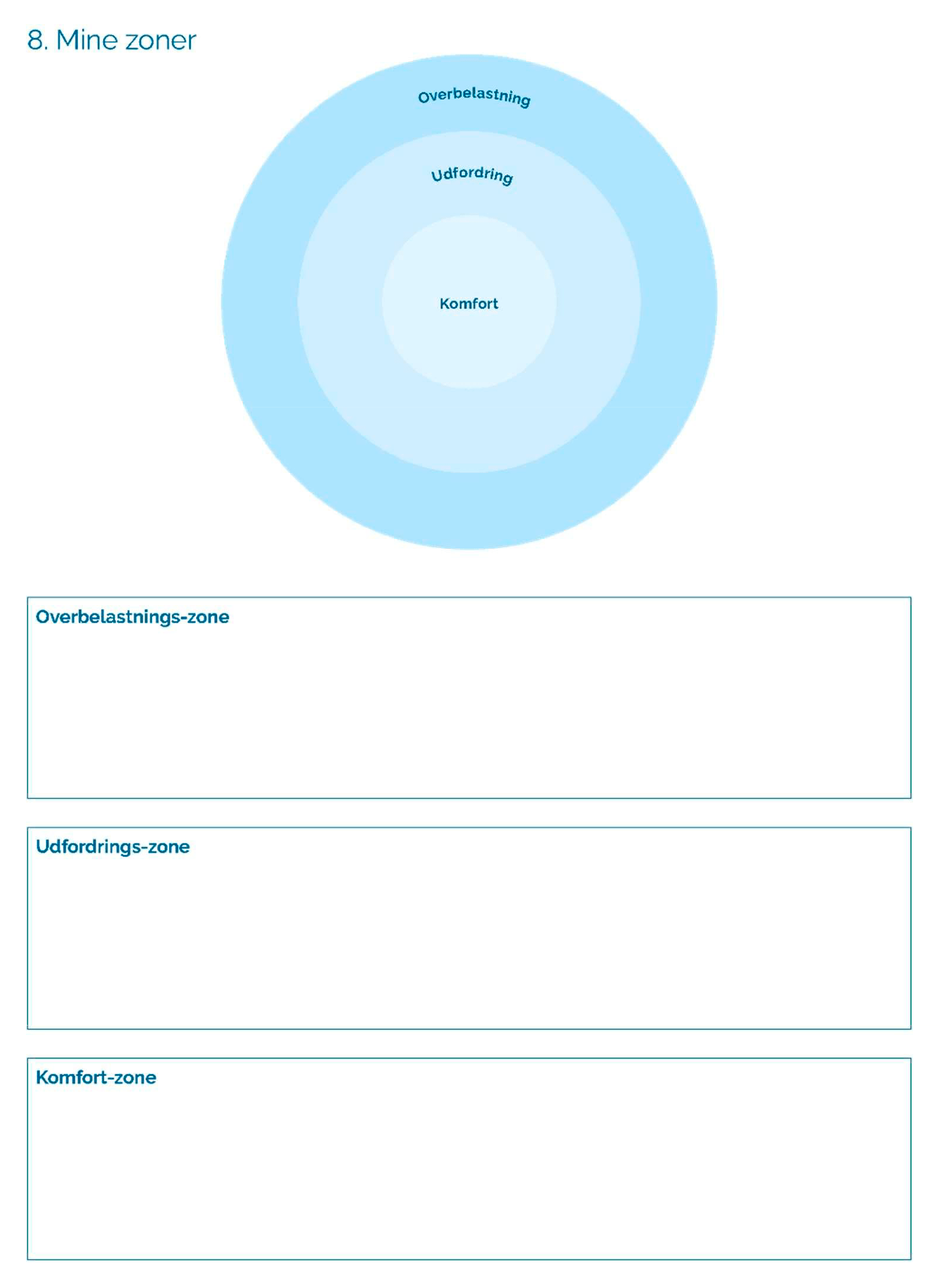 Mine zoner anvendes til at hjælp dig med at finde ud af, hvornår du er i hvilken zone (udfordrings-zonen, overbelastnings-zonen og komfort-zonen).