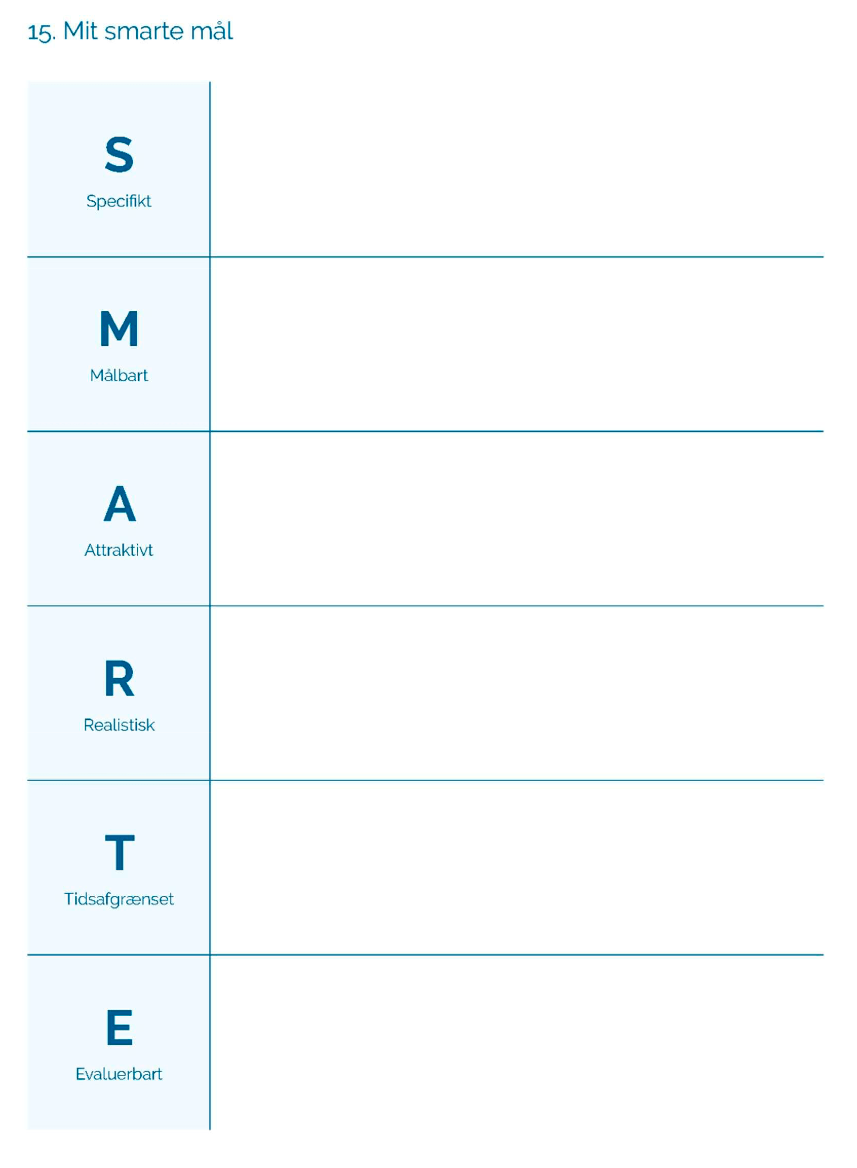 For at kunne evaluere og justere undervejs i dit forløb f.eks. i forbindelse med redskabet ’min måltrappe’, skal du sætte fornuftige mål, hvilket er muligt at gøre ved hjælp af skemaet ’mit SMARTE-mål’. Skemaet anvender du til at tjekke, om de mål, du har sat, er gode og dermed kan opfylde alle elementer i skemaet, herunder om det er specifikt, målbart, attraktivt, realistisk, tidsbegrænset og evaluerbart.