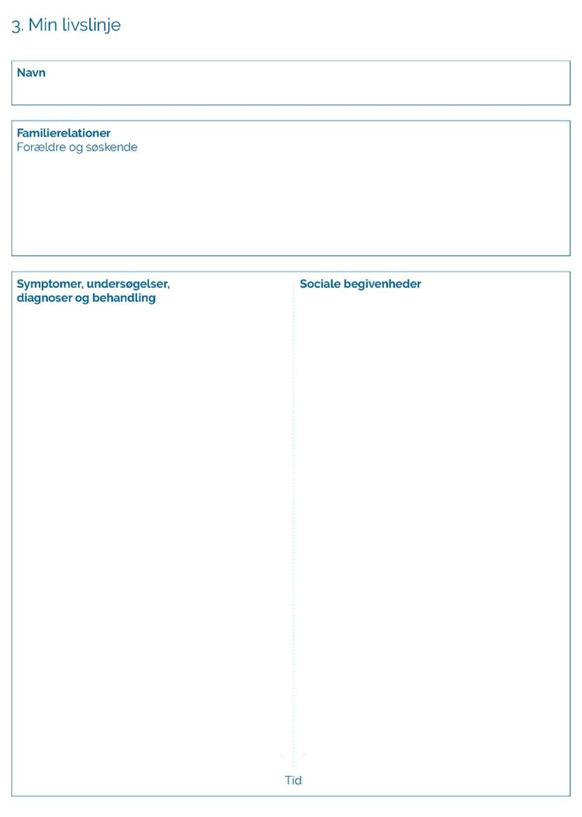 Hvis du har været syg længe, kan det være godt at gennemgå hele dit sygdoms- og livsforløb på en livslinje. Måske har der været perioder i dit liv, hvor du har haft det enten bedre eller værre? Livslinjen kan ligeledes hjælpe din behandler til at få et overblik over, hvilke undersøgelser du har fået foretaget, så intet overses, eller undersøgelser gentages unødigt.