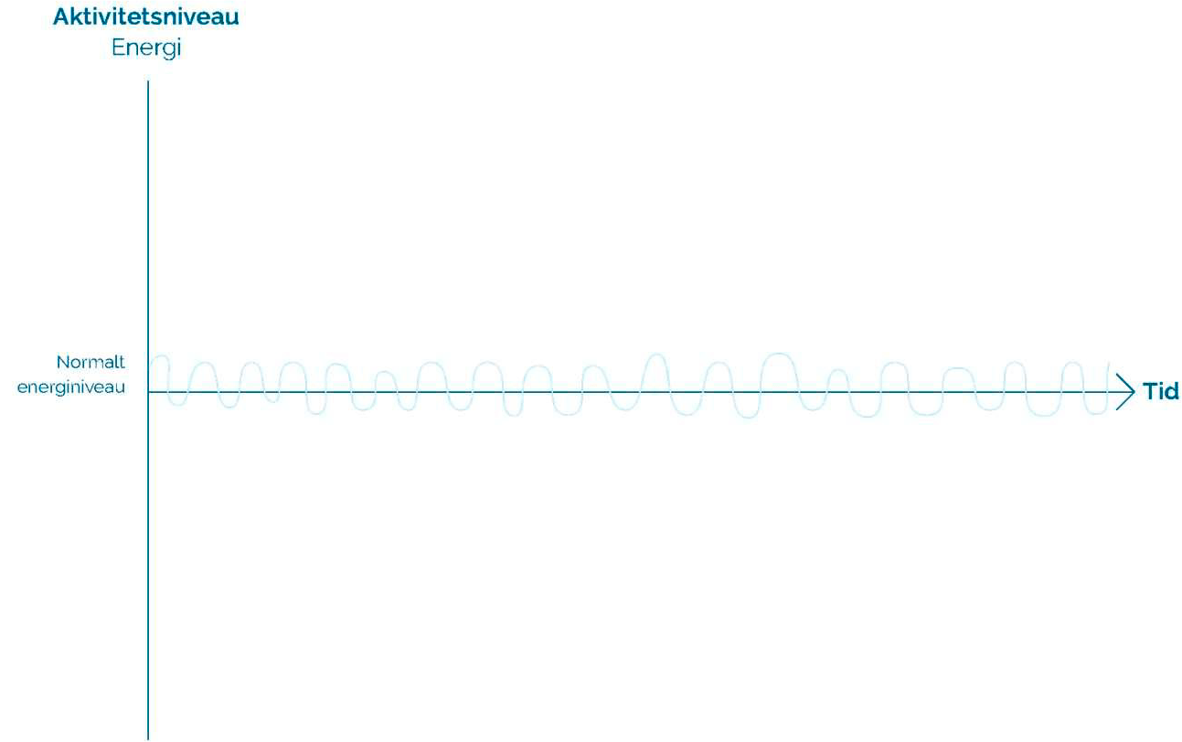 De fleste mennesker har et aktivitets- og energiniveau, som svinger lidt omkring et nogenlunde stabilt niveau. Nogle dage har man mere energi end andre, men som regel kan man passe sit arbejde og de øvrige forpligtelser, man har. Indsættes det i figuren, kan det se sådan ud: