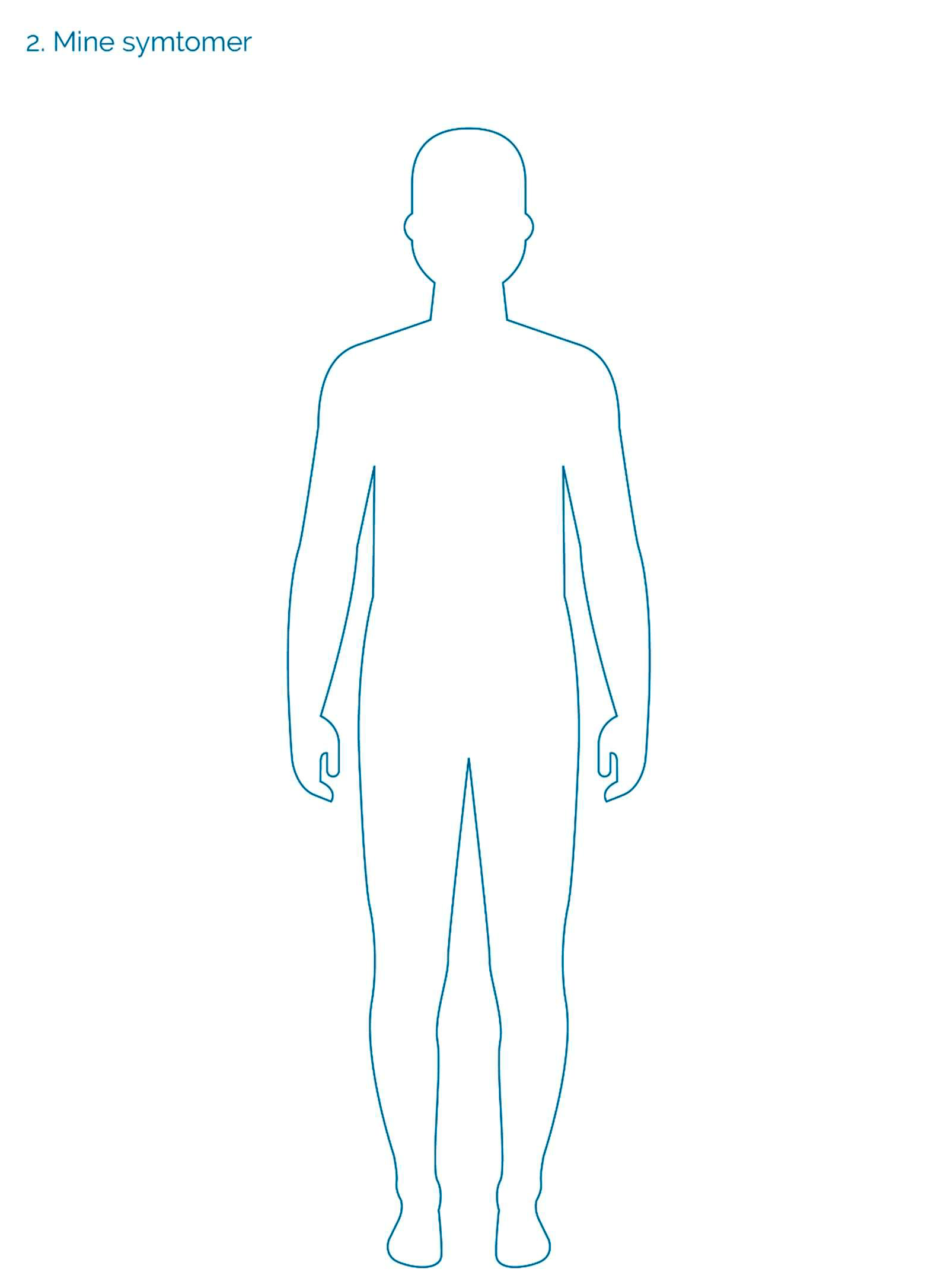 - Beskriv symptomerne og noter hvor på kroppen, du mærkede det pågældende symptom. Du kan vælge at sætte en streg eller pil hen til det område på kroppen, hvor du mærkede f.eks. smerte, føleforstyrrelser, svimmelhed, kvalme, træthed osv. Eller du kan vælge at skravere eller farvelægge de områder i kroppen, hvor de forskellige symptomer sad.