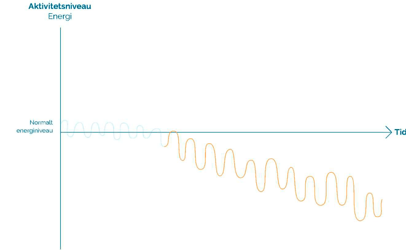 Mennesker, som udvikler en funktionel lidelse, har som udgangspunkt haft et normalt aktivitets- og energiniveau, inden de blev syge, men efter de er blevet syge, kan niveauet være faldet meget, og der kan være begyndt at komme perioder med skiftevis overbelastning og efterfølgende sammenbrud. Indsættes dette i figuren, kan det se sådan ud: